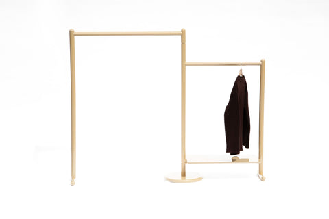 Die Garderobe besteht aus zwei Stangen in unterschiedlichen Höhen für normale und lange Kleidungsstücke wie Mäntel oder Kleider. Die obere Stange kann dabei um 360° um den runden Fuß herumgeschwenkt werden, so dass die Garderobe von kompakt bis lang oder über Eck verschieden genutzt werden kann, je nach individuellen Anforderungen.